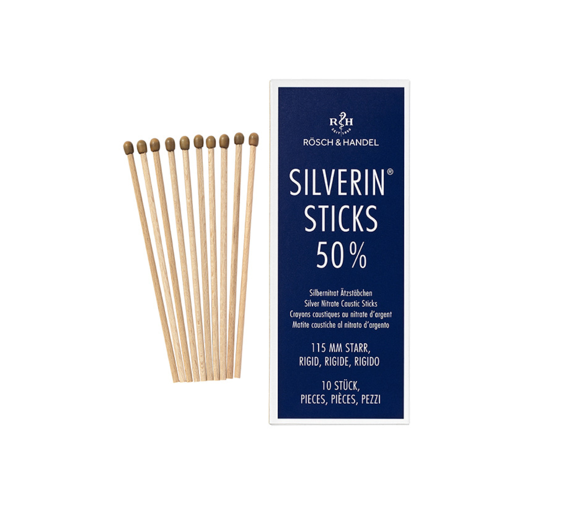Patyczki do wypalania z azotanem srebra służą do chemicznej kauteryzacji za pomocą umieszczonej na główce mieszanki azotanu srebra i azotanu potasu.